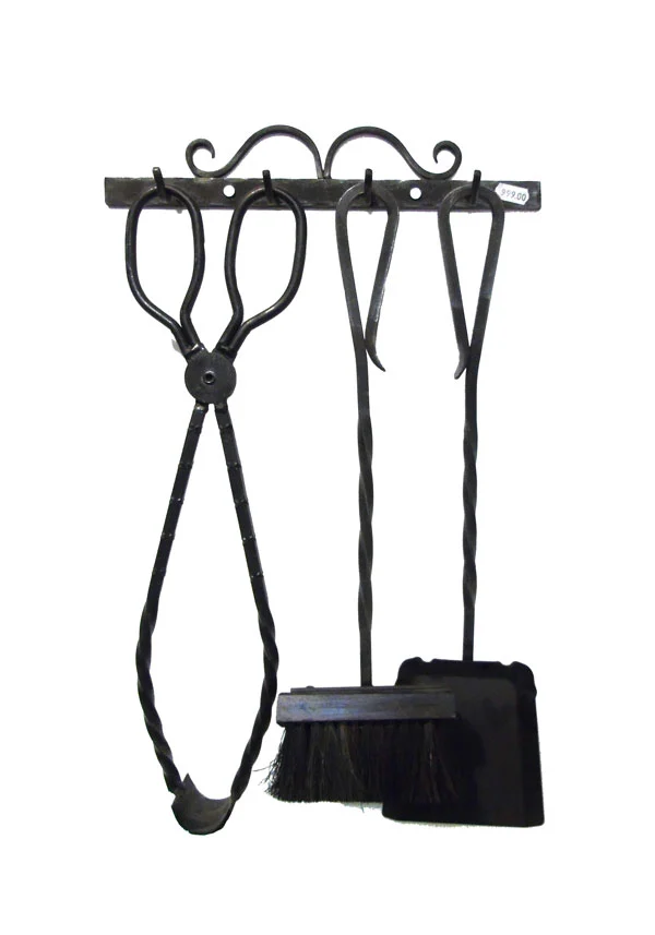 Settet består av veggbeslag, kost, peisklype og spade.
