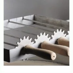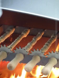 Smart oppsett med 5 stk grillspyd med tannhjulsmekanisme for enkel rotering. Leveres med arm for hengslet sidemontering.