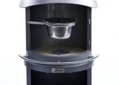 Kjelen legges i en solid rund omramming (medfølger) og kan enkelt svinges ut til siden og løftes vekk.