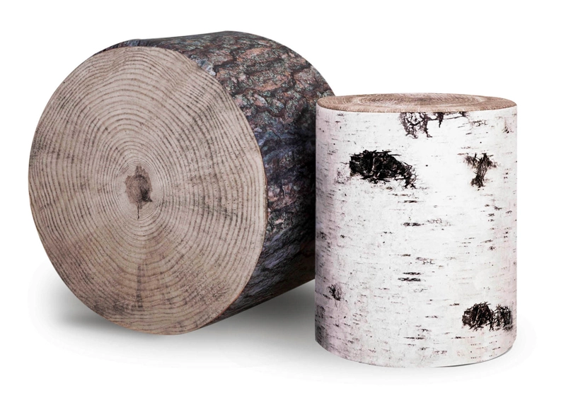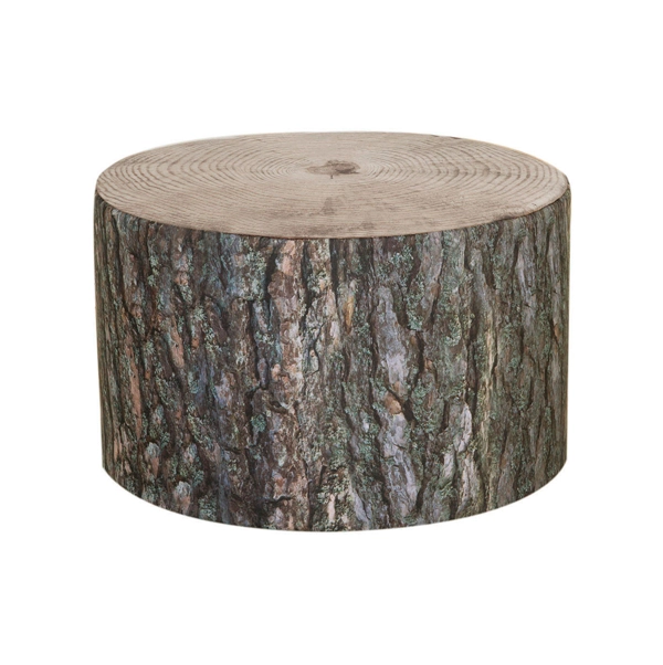 Artig puff utformet som en furustubbe. Puffen er meget lett men fast i formen så man kan stå og sitte på den (isoporkjerne). Trukket med vannavisende og slitesterk polyester med trykk.