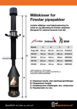 Mange ønsker å ha levende flammer og vedfyrt oppvarming på uteplass med tak, men problematikk med røyk stopper denne muligheten. Vi tilbyr nå stålpipepakker for montering gjennom ute- og terrassetak. Pakkene leveres med sortlakkerte beslag og teleskopløsning for enkel av- og påkobling til din Firestar utepeis eller bakeovn. Legg merke til pipehette med vindavviser, slik at ikke røyken slår ned ved trekk/vind