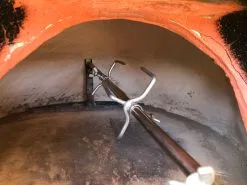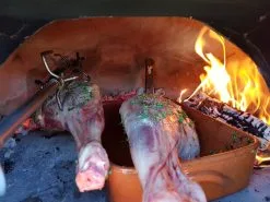 Grillspyd som legges i den todelte døren og i et stativ bak i ovnen.