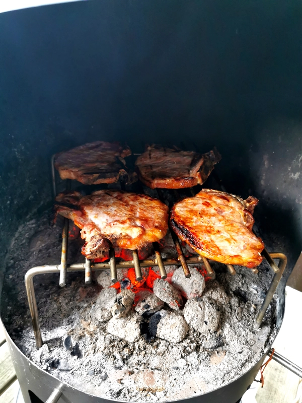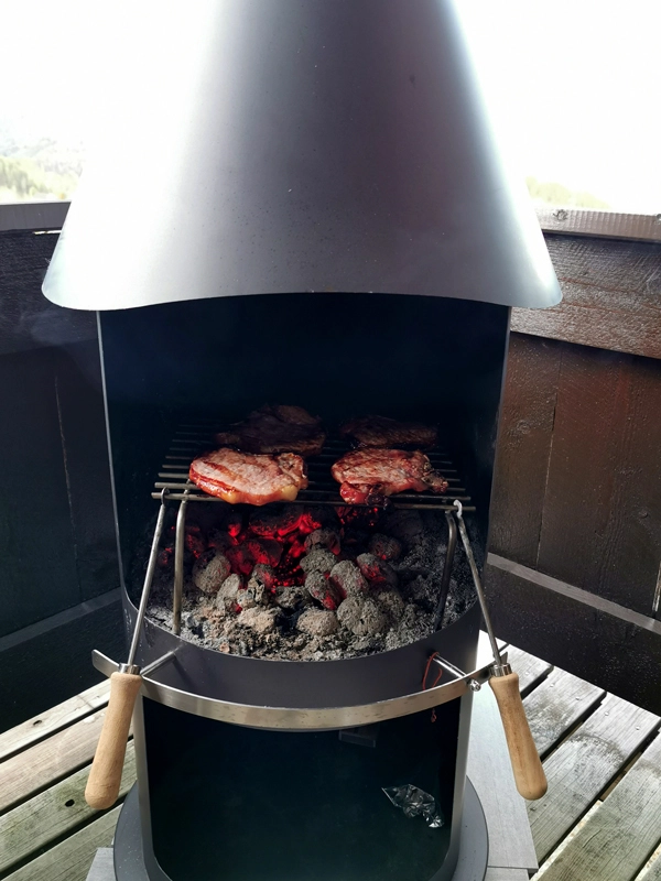 Grillen er laget av 100% rustfritt stål og 2 flotte plasseringsjern med eksklusive trehåndtak er inkludert