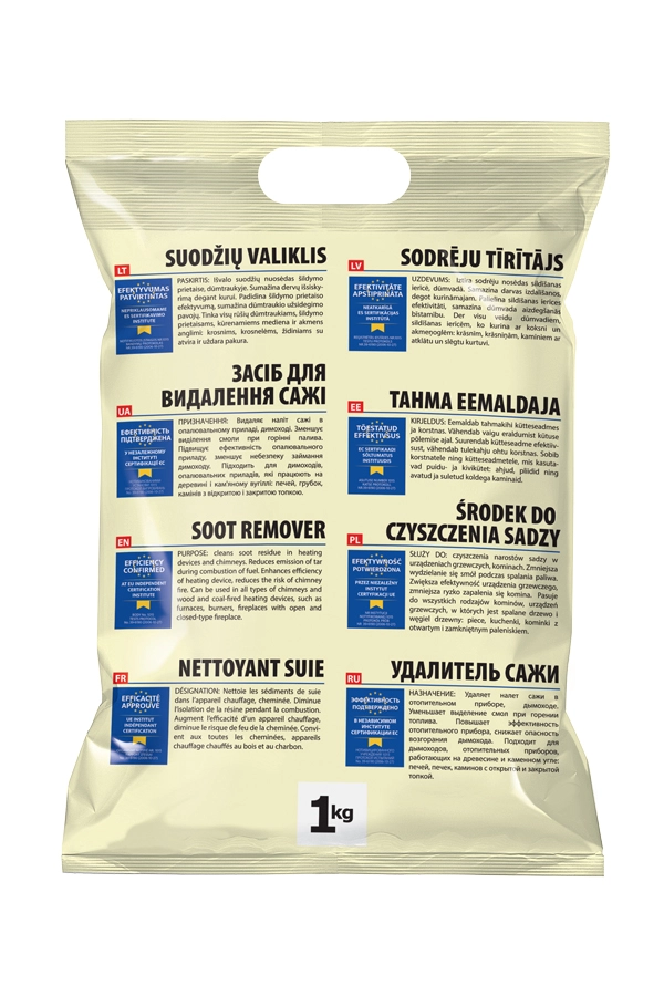Effektive rengjøringsmiddel for rengjøring og vedlikehold av piper, skorsteiner og ildsteder for fast brensel. Sotfjerneren består av en blanding av spesielle krystaller. Noen av komponentene påvirker den katalytisk prosessen ved brenning av ved og bryter ned tjærestoffer i veden til brennbar gass. Ved høye temperaturer frigjør andre komponenter gasser som reagerer med tjæreforekomster og ødelegger dets struktur. Dette svekker bindingen til skorsteinsoverflaten og avsetningene faller ned eller føres ut sammen med røyken.