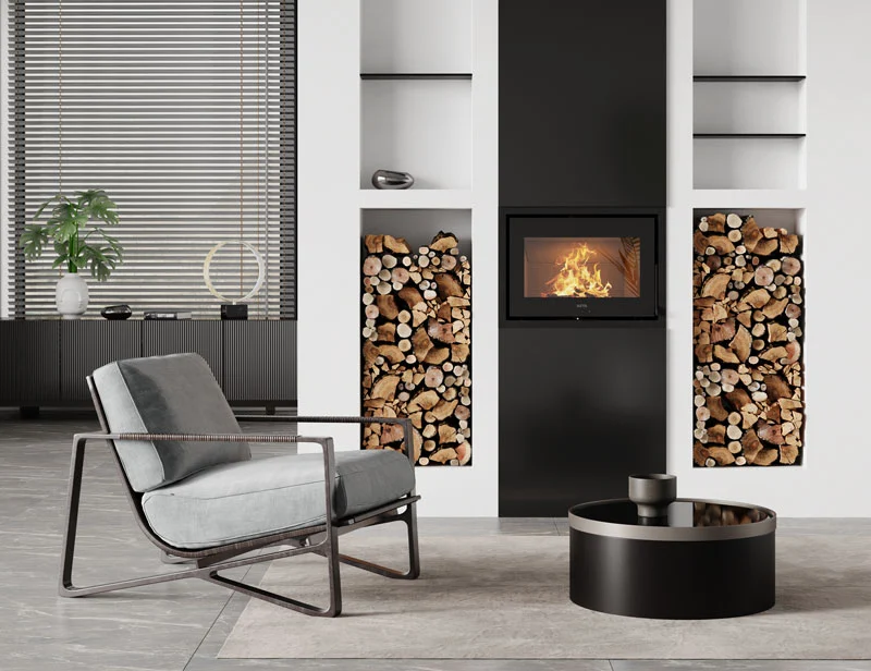 Vistas integrerte dørhåndtak og soft close-system gir peisen et rent og stilig uttrykk, og gjør det enkelt å fyre opp og legge ved igjen.