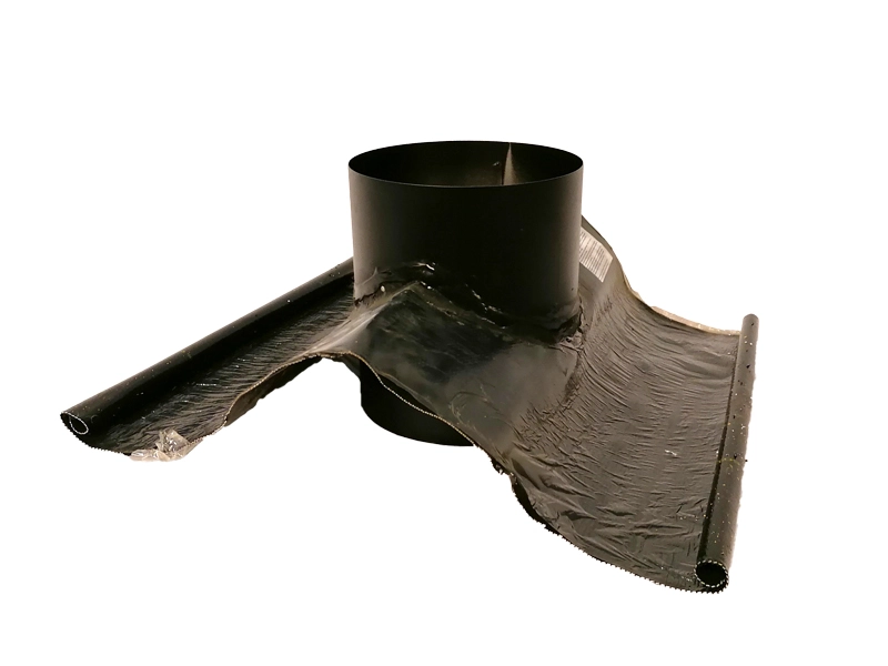 Takinndekning m/krage og silikon. Takinndekkningen er laget i flex og konisk del er utvendig pulverlakkert sort. Brukes/monteres som tetting over tak. Platen kan lett formes underlaget. For tetting mot rør følger det med regnkrage, pakning og silikon.