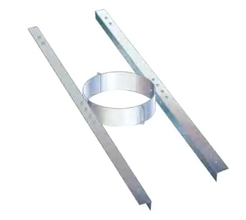 Taksperrestyring m/vinkeljern L100 cm. Består av 2 halvmåner/klemring og vinkeljern i galvanisert stål samt skruer/festemateriale. Brukes for å feste/stabilisere pipen mot vær og vind, samt feiing. Monteres under tak der en kommer til mellom taksperrene, eksempel kaldloft.