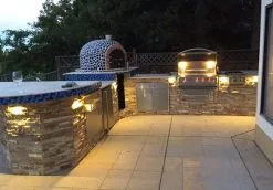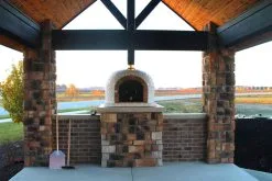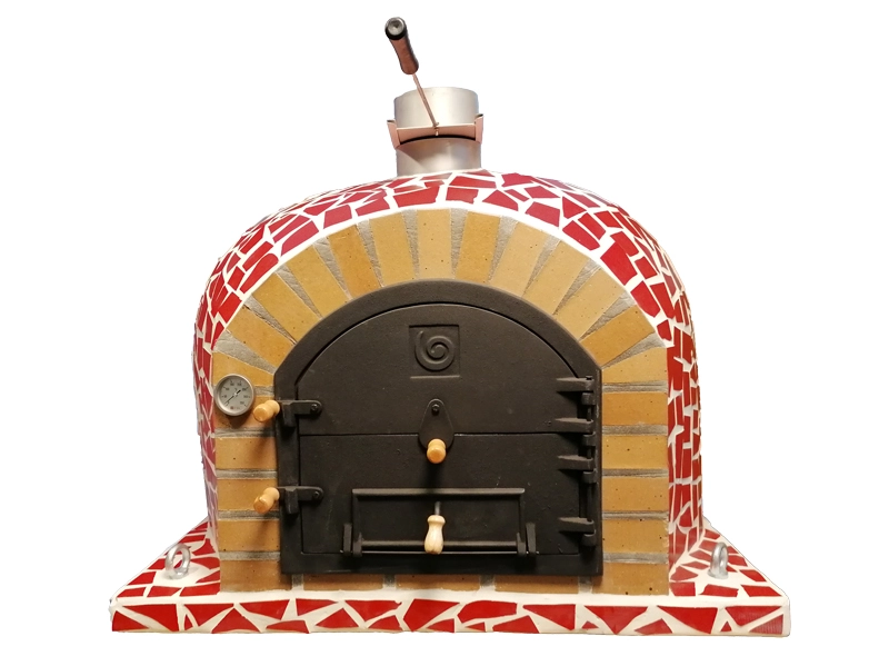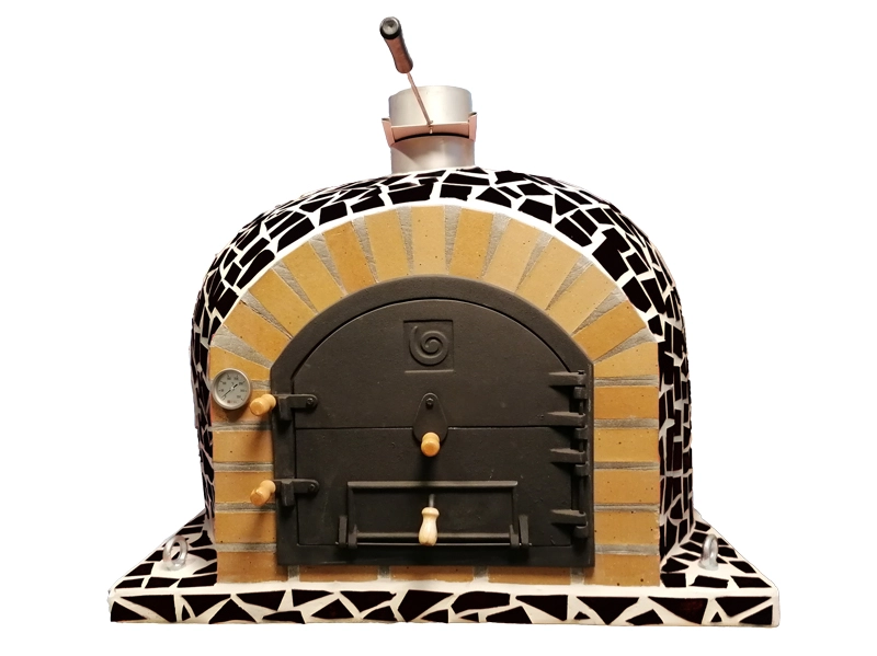 God plass til pizza og ca 7 brød. Ovnen oppnår ca 370 ° C etter ca 1,5 time. Denne bakerovnen har stor kapasitet, og det er fullt mulig å steke «hundrevis» av pizzaer på 1 dag. Eks: Pizza med tynn bunn er ferdig stekt på ca 90 sek ved 310 ° C i ovnen. Innerst har ovnen et leirelag, så kommer en 7,5 cm keramisk isolasjonsmatte av silikatfiber og ytterst et værbestandig lag: fugemasse/keramikkfliser. Dette gjør at ovnen holder godt på varmen. Den har todelt dør, med plass til grillspyd som festes bak og i døren. Ovnene håndlages og kan ha små avvik fra bildet.