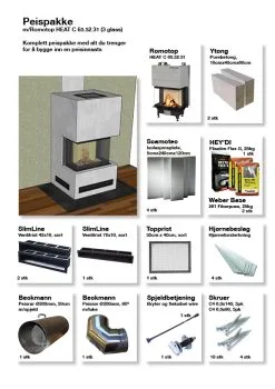 Romotop HEAT C 3g L 65.52.31.21 er en eksklusiv peisinnsats med glass på 3 sider. Nå kan du kjøpe denne som komplett peispakke med alt du trenger for å bygge en komplett peis.