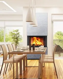 Peisen Lako er best egnet for installasjon mot rettvegg og gjerne sentralt i rommet da peisbålet har godt innsyn med glass på 3 sider.