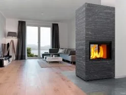 Store horisontale peisvinduer innbyr til hyggelige øyeblikk foran den fascinerende peisen, og ovnens utmerkede oppvarmingskapasitet garanterer en hyggelig atmosfære.