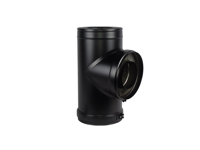 Isolert pipeelement (DW) m/t-stykke 85 gr. Pipedelen er laget i rustfritt stål (indre + ytre rør) og er utvendig pulverlakkert sort. Brukes/monteres ved tilkobling av ildsted med bakuttak og/eller veggjennomføring.