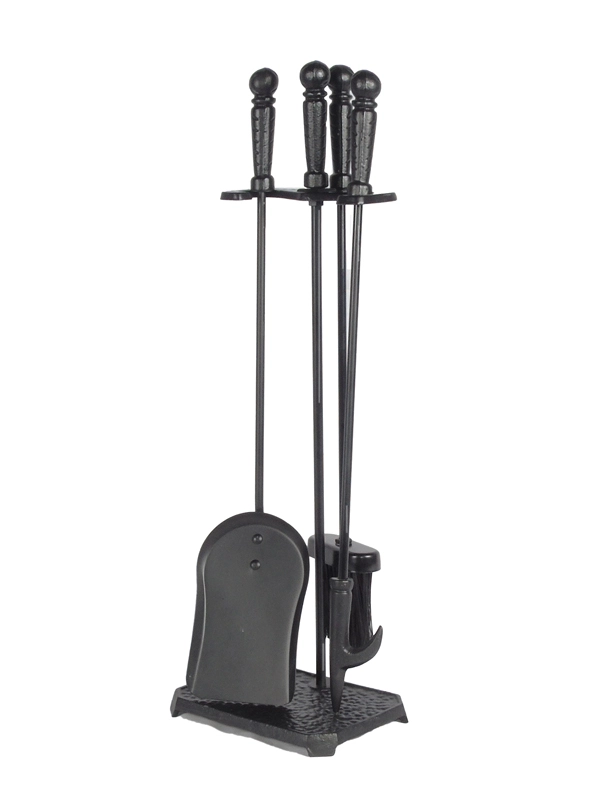 Stativ med tre verktøy (ildrake, kost og askespade) i lakkert sort stål med trehåndtak.